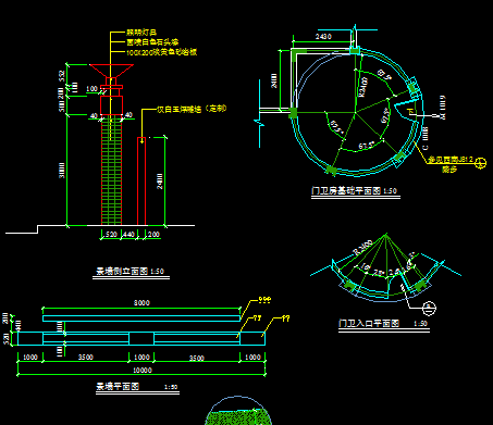 介绍: 大门设计图包括门卫入口平面图、门卫房基础平面图、景墙平面图、圆顶大样图、剖面图等