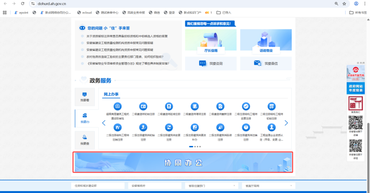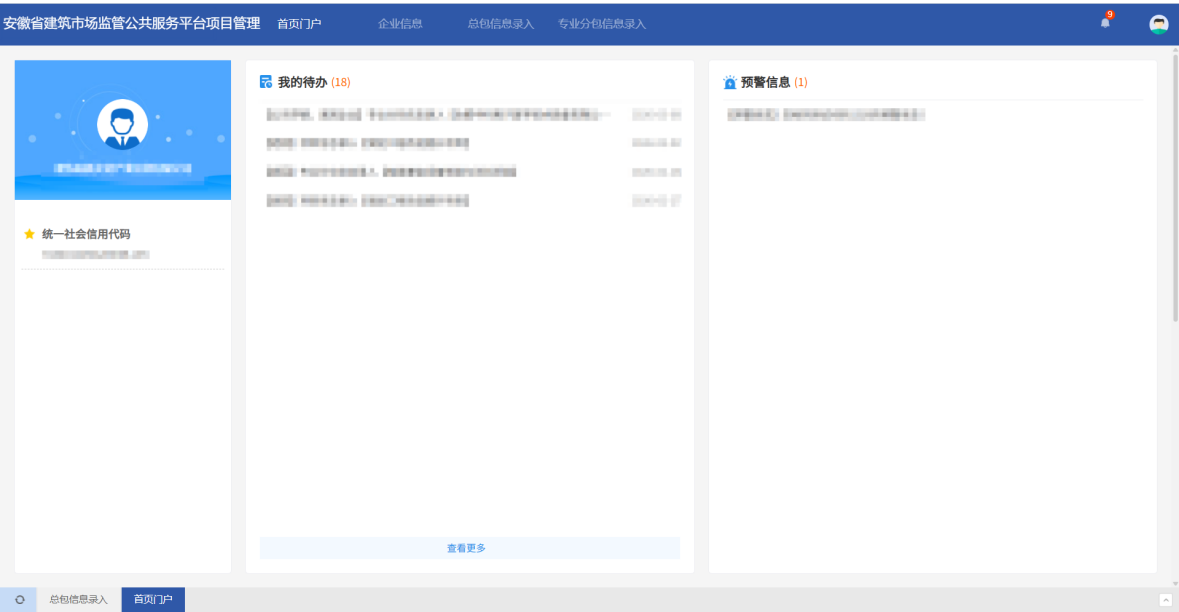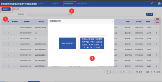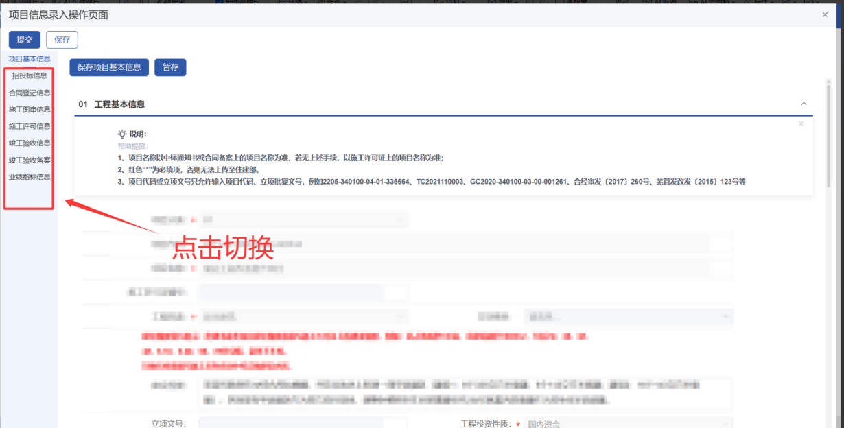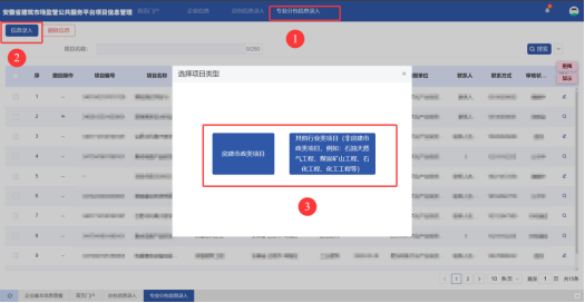 进入安徽省住房和城乡建设厅官网,点击页面下方【协同办公】——进入【安徽省建筑市场监管公共服务平台】——点击【企业入口】 图1-1 厅网站协同办公入口 图1-2 安徽省建筑市场监管公共服务平台入口 登录企业皖企通账号,进入安徽省建筑市场监管公共服务平台 图1-3企业登录页面入口 登录后,点击【法人用户入口】 图1-4 法人用户入口 企业首次登录需要完善企业信息,填写完成后点击【完善信息】 图1-5 完善信息 点击页面右上角【项目信息管理】,进入项目信息管理模块 图1-6项目信息管理入口 模块首页: 图1-7 模块首页 温馨提示:目前各级住房城乡建设主管部门正在配置项目信息各步骤审核人员权限,预计3月15日完成,企业可先在系统录入、保存信息,待审核人员权限配置完成后提交审核。 点击【总包信息录入】——【信息录入】,根据项目实际类型,选择【房建市政类项目】 图2-1 房建市政类项目录入入口 在弹窗中通过【项目名称】或【省级项目编号】搜索并选择已在全国建筑市场监管公共服务平台中展示的项目: 图2-2 房建市政类项目搜索页面 在搜索结果中勾选对应项目,进入环节信息填报环节: 图2-3 房建市政类项目选择 选择项目之后,进入信息填报页面,页面左侧展示了可以录入的项目环节信息,包含合同登记信息、招投标信息、专业技术人员信息(在施工图审信息中录入)、竣工验收信息、业绩指标信息等。点击按钮可进行切换。 图2-4 房建类项目环节信息切换 其中,【项目基本信息】环节自动同步建筑市场汇总库信息,仅用于信息核实,不允许进行修改。 图2-5房建市政类项目基本信息页面 企业无需录入所有环节信息,仅选择实际需要录入的环节信息填写即可。 以录入【竣工验收信息】为例,首先点击页面左侧按钮,切换至【竣工验收信息】环节,然后点击【新增信息】,新增一条竣工验收数据记录。 图2-6新增竣工验收环节信息 在新增数据记录弹窗页面内,首先在【单项工程信息】栏目中点击【新增关联】,选择此条竣工验收信息关联的单体 图2-7 竣工验收关联单体信息 然后填写竣工验收信息 图2-8竣工验收信息填写栏目 关联竣工验收涉及的五方单位相关信息 图2-9 竣工验收五方单位关联页面 然后上传申报所需的申请材料 图2-10 竣工验收佐证材料上传 信息填写完成后,点击【保存并关闭】,保存竣工验收信息。 图2-11 竣工验收信息保存 接下来根据实际需求填写其他环节信息,全部填写完成后点击【提交】,即可提交信息录入流程。 图2-12 切换其他环节信息/提交申请 点击【总包信息录入】——【信息录入】——【其他行业类项目】 图2-13 其他行业类项目信息录入入口 其他行业类工程项目信息录入分为两种情况: 一是已在全国建筑市场监管公共服务平台上展示的项目,需完善录入相关环节信息的,在弹窗中通过【项目名称】或【省级项目编号】搜索并选择全国建筑市场监管公共服务平台中的项目: 图2-14 其他行业类项目搜索 图2-15 其他行业类项目选择 二是2024年 1月 1 日以来,在安徽省行政区域内符合法定基本建设程序的已竣工验收合格的矿山、电力、冶金、石油化工、机电等工程项目,需首次录入的项目,点击左上角【新增项目】进行填报: 图2-16其他行业类项目新增 在信息填报页面中,首次录入的项目,需要先完善项目基本信息,首先填写项目基本信息表单: 图2-17其他行业类项目基本信息录入 然后完善项目单体信息 图2-18 其他行业类项目单体信息新增 最后上传项目基本信息相关佐证材料,并保存信息 图2-19 其他行业类项目基本信息佐证材料上传 然后点击左侧按钮切换并填写其他信息项,录入合同登记信息、招投标信息、施工许可信息、竣工验收信息、企业业绩指标信息等。 图2-20其他行业类项目环节信息 填报示例见2.1.2。 已关联建筑市场中项目基本信息的项目,在信息填报页面中,可根据实际需求,点击左侧按钮切换并填写任意信息项 图2-21其他行业类项目环节信息切换 填报示例见2.1.2。 点击【专业分包信息录入】——【信息录入】——选择项目类型,进入项目选择页面: 图2-22 专业分包信息录入入口 通过项目名称或省级项目编号搜索已在全国建筑市场监管公共服务平台中展示且已竣工验收合格的总承包项目: 图2-23 专业分包项目搜索 在搜索结果中勾选对应总承包项目,进入信息填报环节: 图2-24 专业分包项目选择 选择项目之后,进入信息填报页面,页面左侧展示了可以录入的项目环节信息,包含合同登记信息、招投标信息、施工许可信息、竣工验收信息、竣工验收备案信息、业绩指标信息等。点击按钮可进行切换信息项 图2-25专业分包指标项切换 其中,【项目基本信息】环节自动同步建筑市场汇总库信息,仅用于信息核实,不允许进行修改。 图2-26 专业分包项目基本信息 企业无需录入所有环节信息,仅选择实际需要录入的环节信息填写即可。 填写示例见2.1.2 答:安徽省行政区域内工程建设项目信息已在全国建筑市场监管公共服务平台(以下简称全国平台)展示,但缺少相应的工程建设项目环节信息,如:施工许可信息(含施工许可证信息、开工令或开工报告信息等)、合同登记信息、招投标信息、业绩指标信息(企业业绩指标、个人业绩指标)等。可向项目所在地住房城乡建设主管部门申请录入相应的工程建设项目环节信