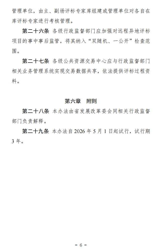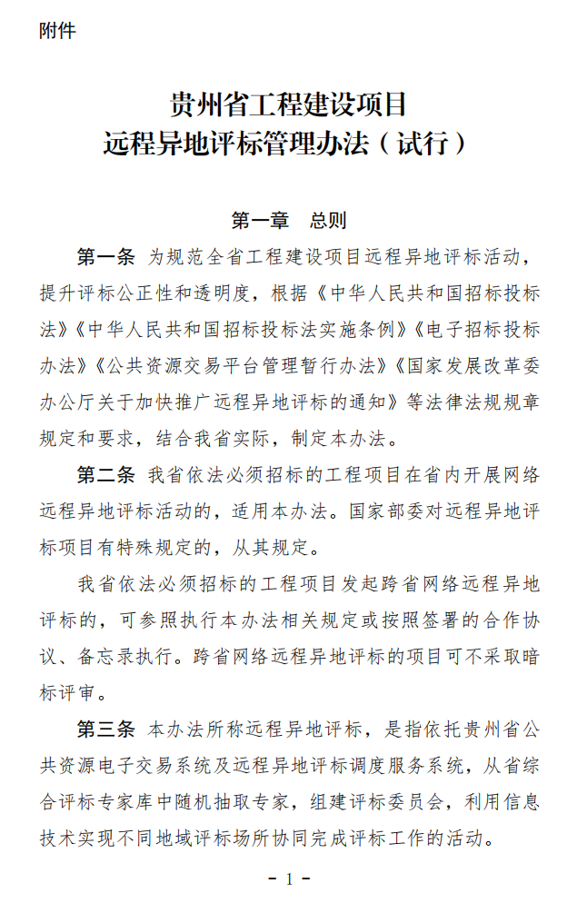 省发展改革委等十部门关于印发《贵州省工程建设项目远程异地评标管理办法(试行)》的通知 黔发改法规〔2026〕129号 各市(州)发展改革、工业信息化、住房城乡建设、交通运输、水利(水务)、农业农村、商务、能源、广播电视主管部门,各市(州)公共资源交易中心: 为进一步规范我省工程建设项目远程异地评标活动,提升评标活动公正性和透明度,省发展改革委会同省相关部门制定了《贵州省工程建设项目远程异地评标管理办法(试行)》。现印发给你们,请结合工作实际,认真抓好落实。 附件:贵州省工程建设项目远程异地评标管理办法(试行).pdf 贵州省发展和改革委员会 贵州省工业和信息化厅 贵州省住房和城乡建设厅