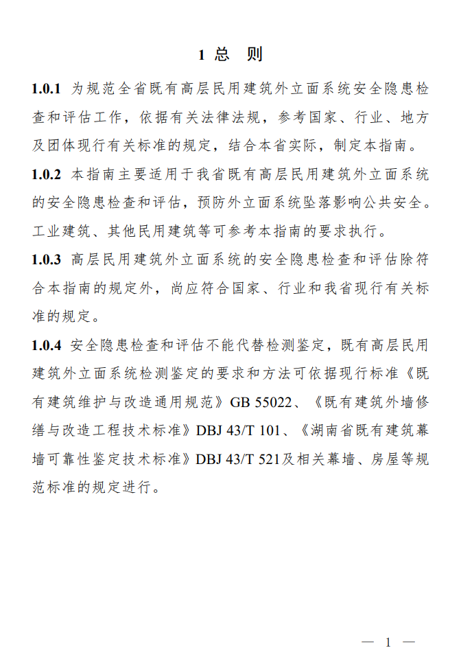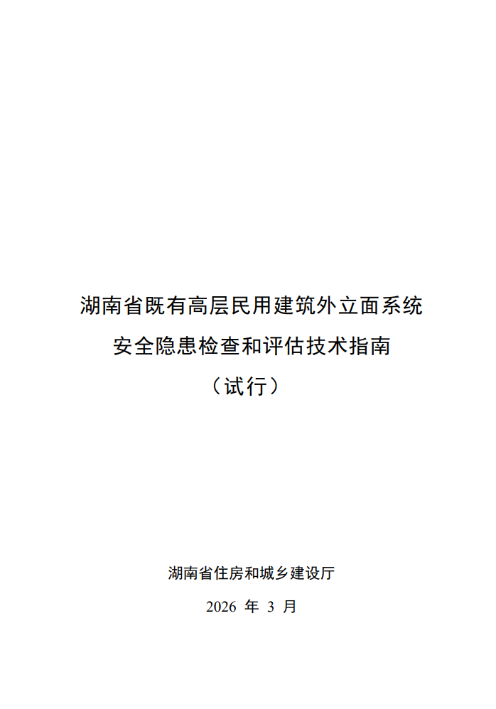 湖南省既有高层民用建筑外立面系统安全隐患检查和评估技术指南 本指南共分为6章和3个附录,主要内容包括:总则、术语、基本规定、建筑幕墙系统、建筑其他外立面系统、检查评估结论及处置建议等。 附件下载:湖南省既有高层民用建筑外立面系统安全隐患检查和评估技术指南