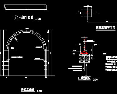 介绍: 简易花架设计详图包括花架平面图、花架基础平面图、花架立面图